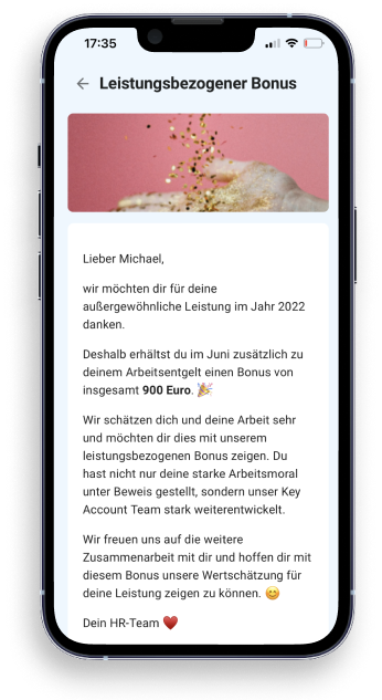 Ankündigungen zu leistungsbezogenen Prämien oder Boni können ganz einfach gestaltet und den betreffenden Mitarbeitern per App veröffentlicht werden.
