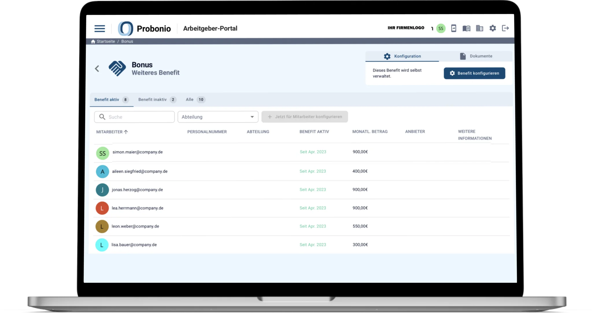 Mit nur wenigen Klicks Benefits einrichten und passend zum Unternehmen gestalten.