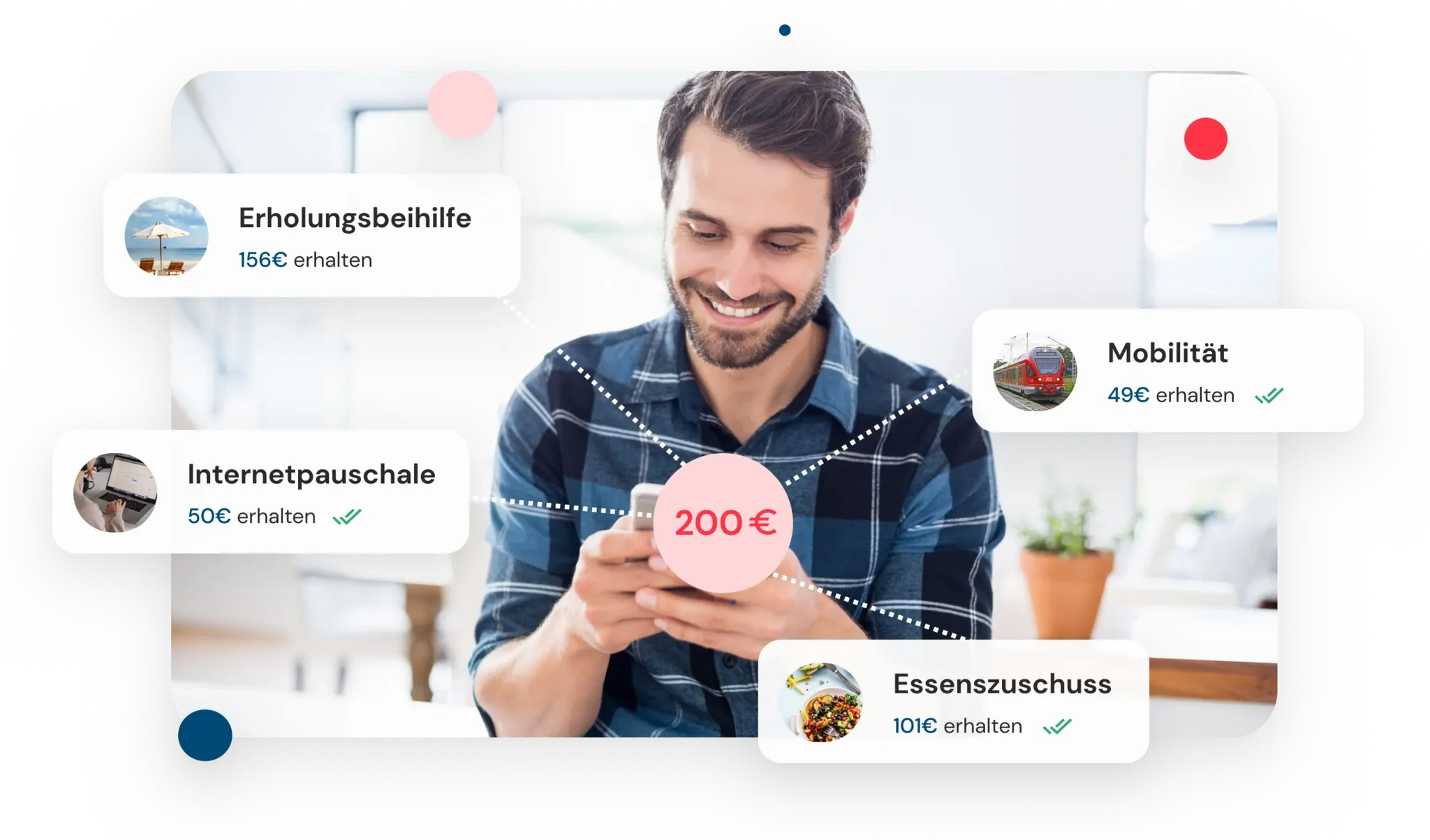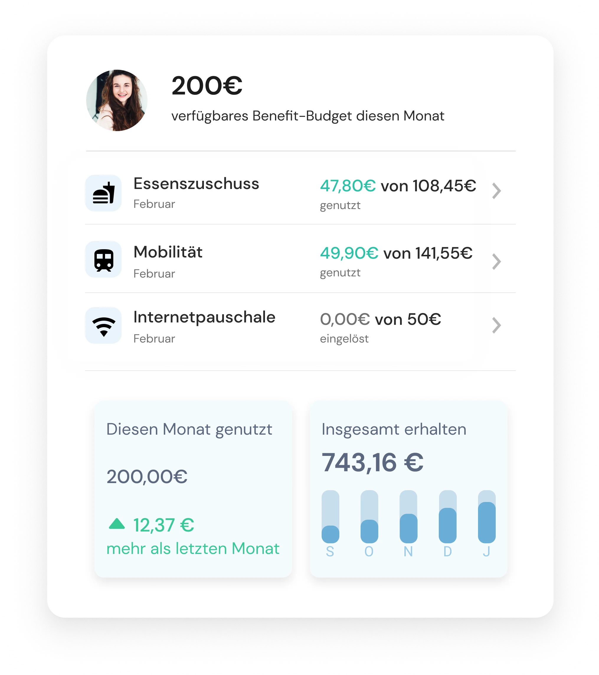 Arbeitgeber legen ein festes Budget fest, während Mitarbeiter:innen die volle Unabhängigkeit haben: Mit der Freiheit bei der Budgetverteilung für den Essenszuschuss, das Mobilitätsbudget, die Erholungsbeihilfe, den Kita-Zuschuss oder die Internetpauschale können Benefits passend zu den individuellen Bedürfnissen flexibel genutzt werden.