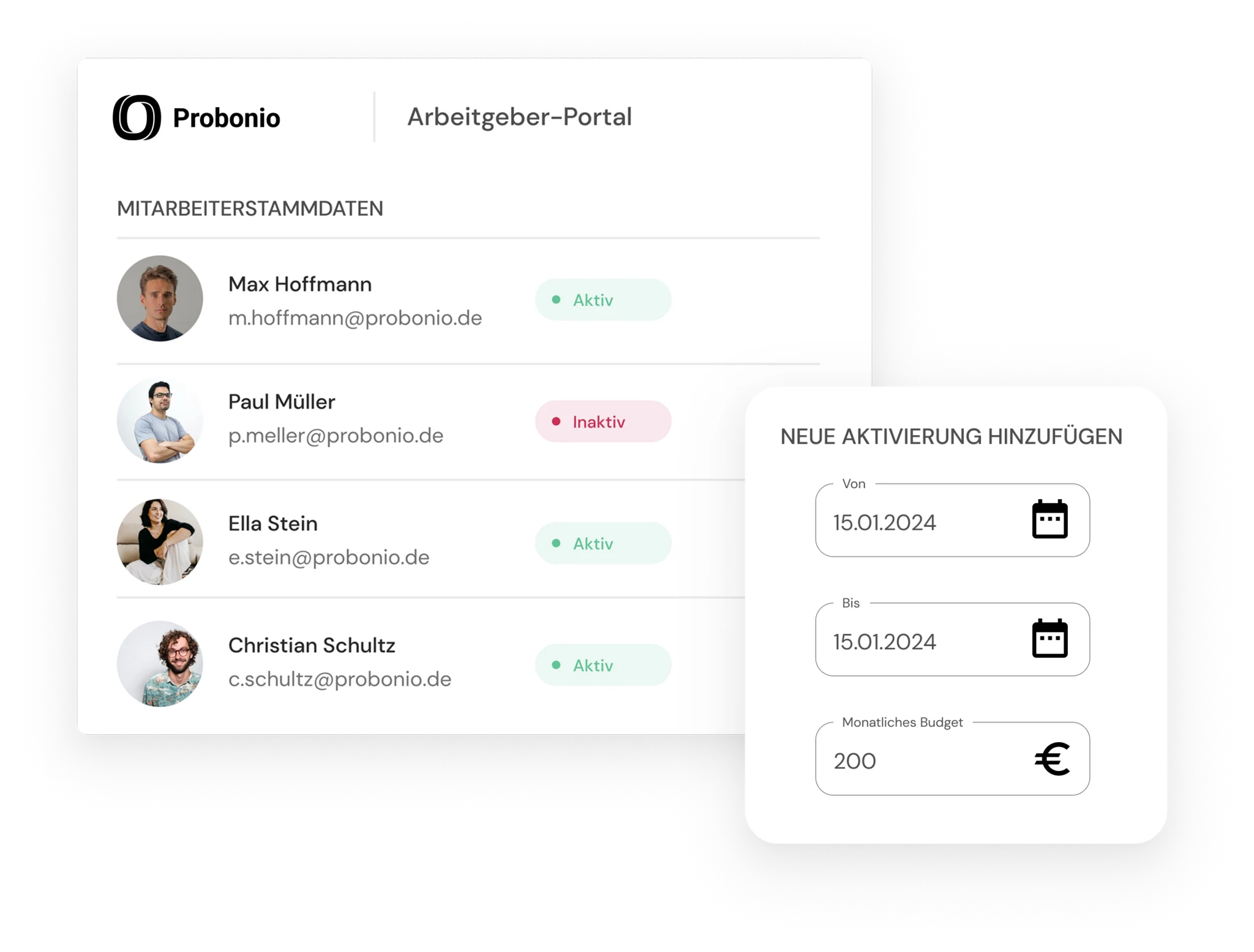 “Mit Probonio konnten wir in unserem Unternehmen Mitarbeiter-Benefits in kürzester Zeit implementieren. Die Apps für die Verwaltung und für die Mitarbeiter sind sehr übersichtlich und ansprechend gestaltet. Dank der automatischen Übermittlung der Daten an unseren Steuerberater entsteht uns dabei quasi kein wiederkehrender Aufwand, das war uns sehr wichtig.”